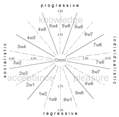 Your results on all types are calculated into two mean scores. Your Vmean is 3.06 and your Hmean is 4.94. Plotting them on the Enneagram map determines your overall unconscious personality type which is 4w5. (To learn more about the rational/formula behind this test click here.)